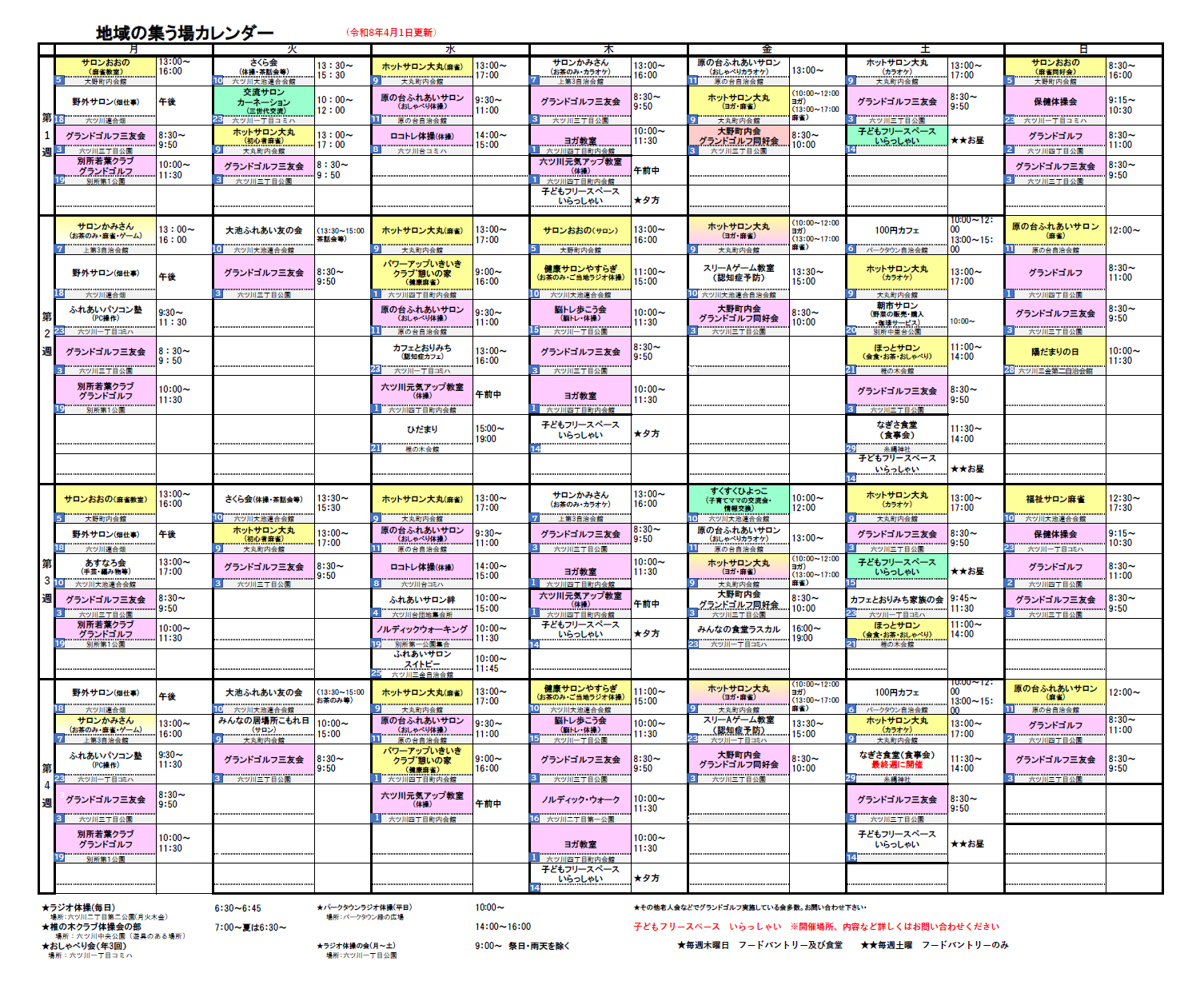 地域で行われている活動の開催日・時間を曜日ごとにまとめ、カレンダーにしました。興味のある活動がありましたらぜひご参加ください。
